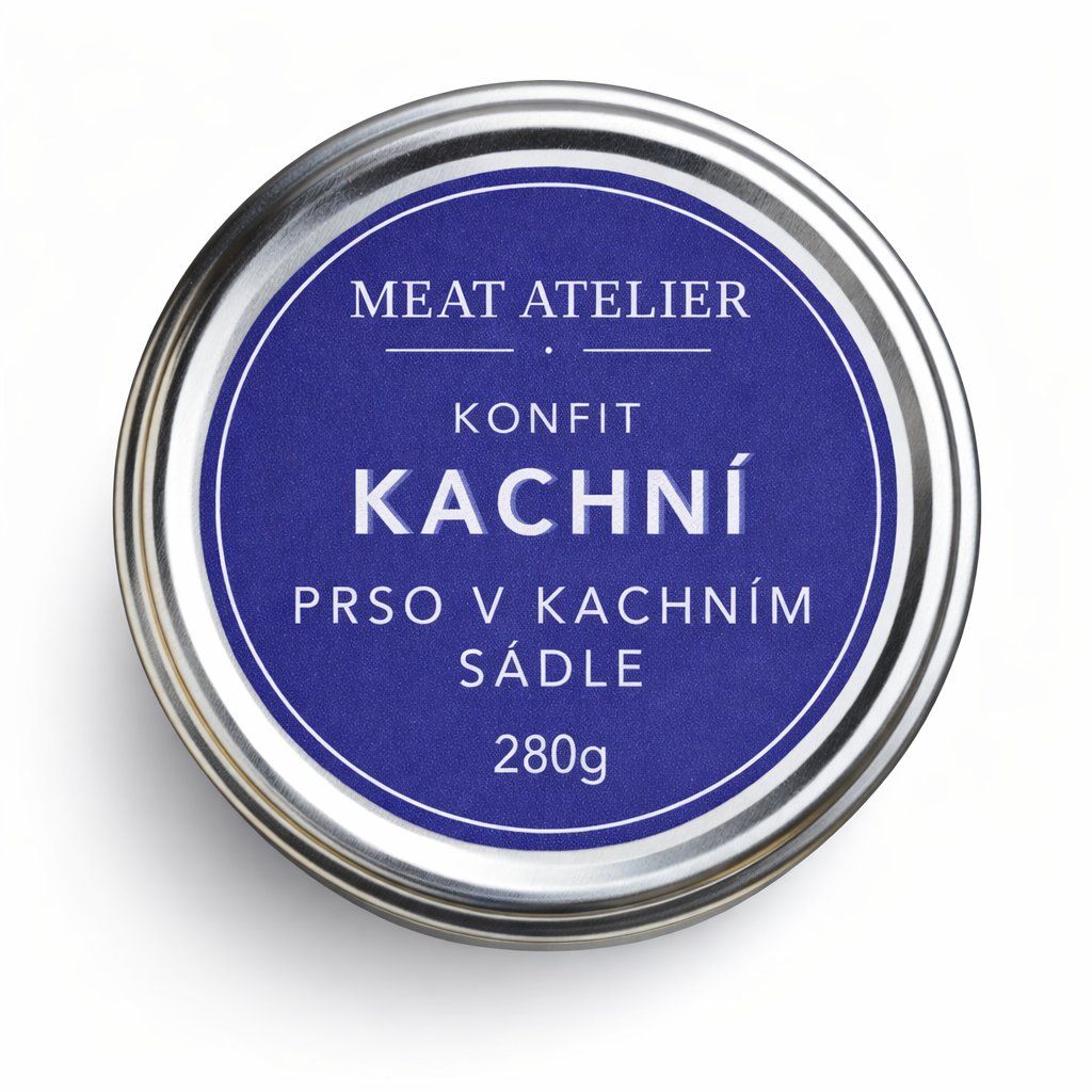 Kachní prso 50%, kachní sádlo 45%, bílé víno, cibule, bylinky, koření, česnek, mořská sůl, třtinový cukr. Obsah soli max. 2,5%, obsah tuku max. 60%.