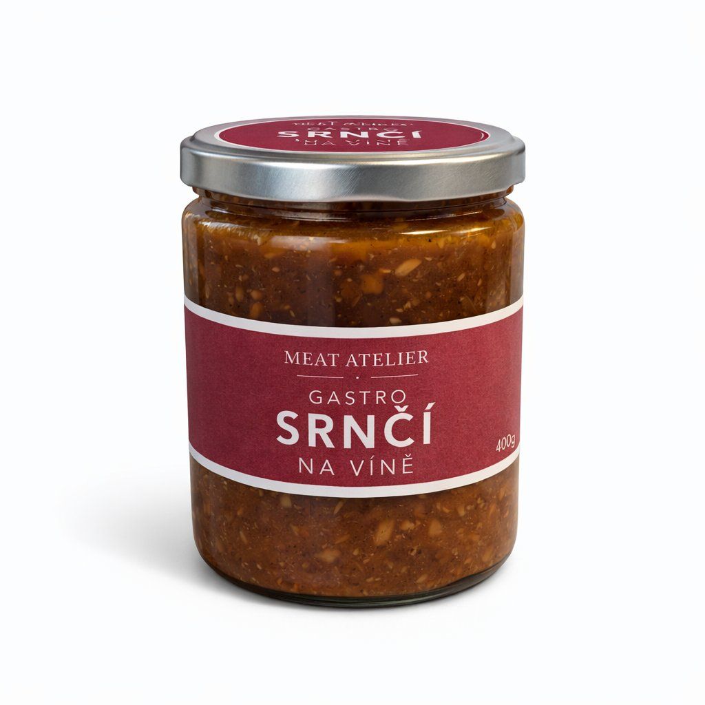 Srnčí na víně Meat Atelier je hotové jídlo připravené z kvalitního českého masa ze Šumavy a poctivých surovin bez chemie a éček. Maso pomalu dusíme, aby zůstalo šťavnaté, měkké a plné přirozené chuti zvěřiny.
